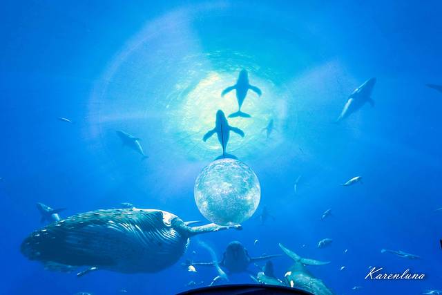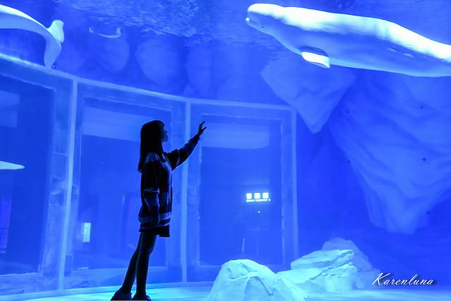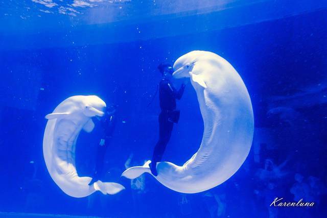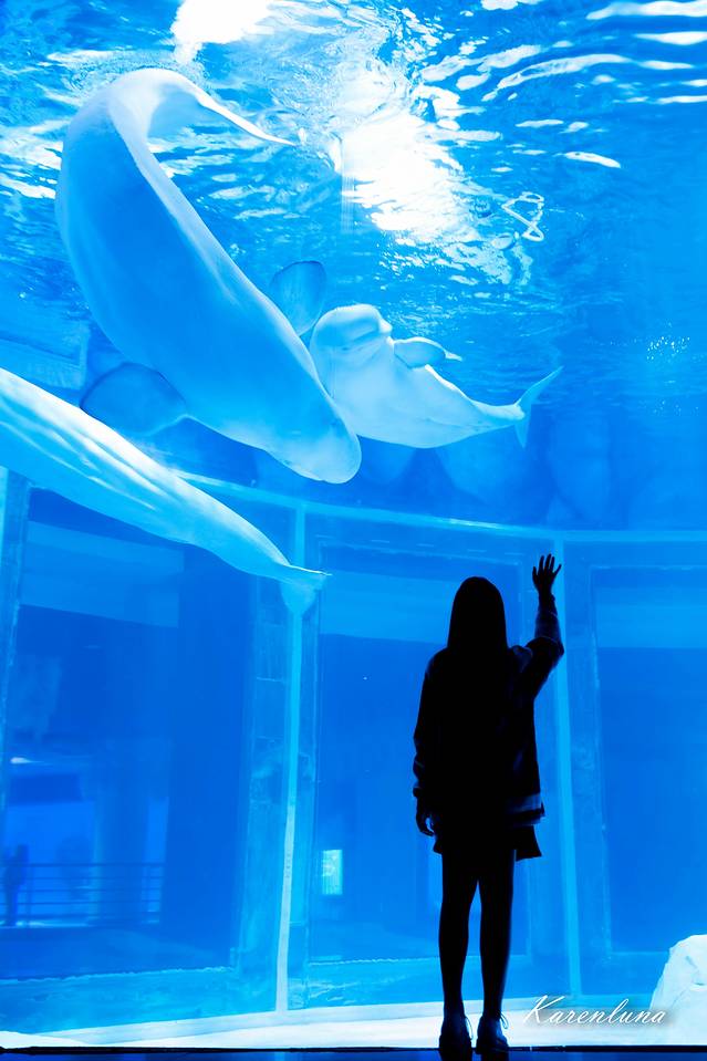 既然不能与它们同游,合张影总是好的。站在硕大的玻璃墙前,待白鲸从远处慢慢游过,与它来个眼神上的交流,随手一拍,将如此浪漫的画面定格在那个瞬间。