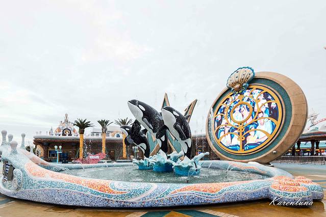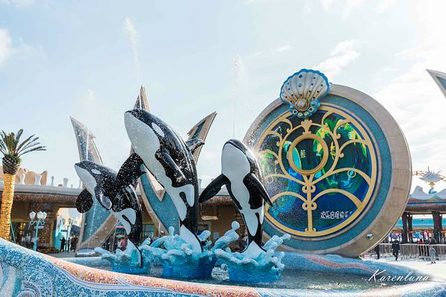 来到大门口,一个小型喷泉屹立在广场中间。三只可爱的虎鲸从海中飞跃而起、虎鲸的喷气口变成了喷泉,水花从天空中飞溅而下,像极了大海的层层浪花。而后面的大型时钟,与公园内的主题相映成趣,寓意着时空穿梭,寓意着宇宙的演变和生命的延续。