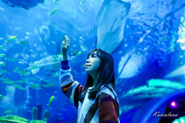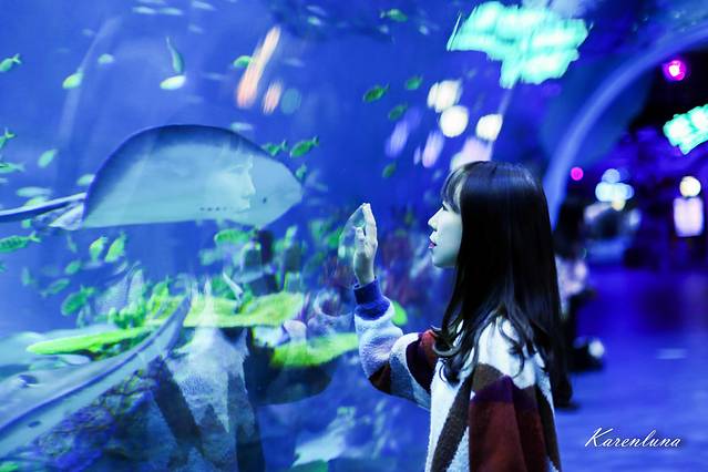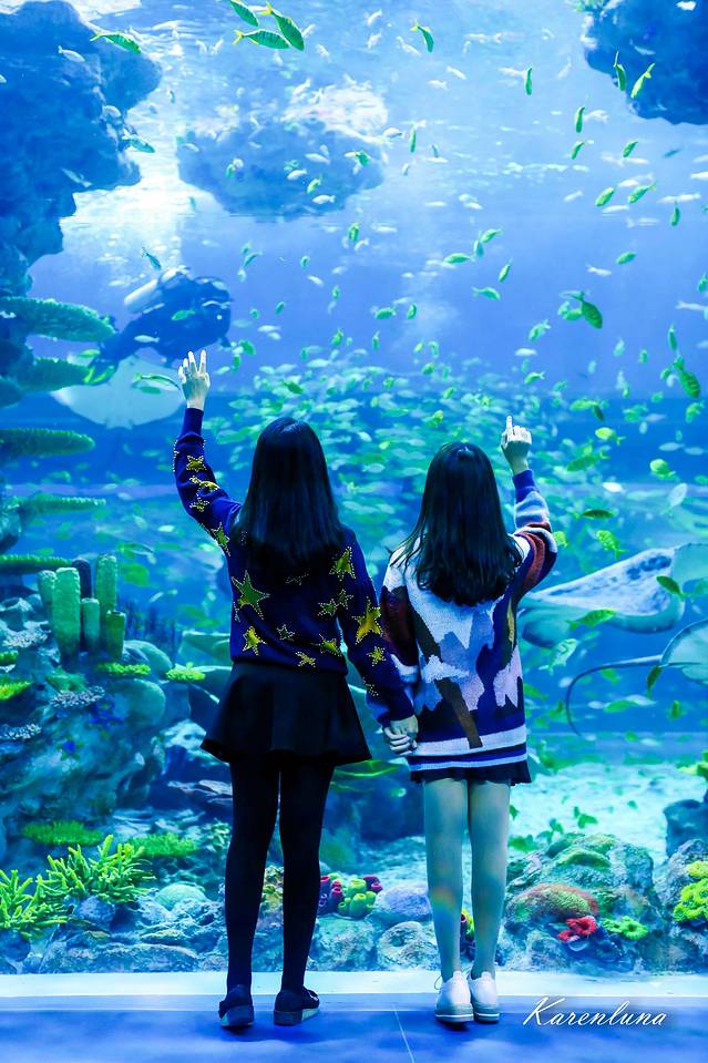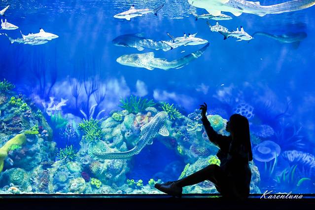 喜欢这里还有一点,那就是超级适合拍照。虽然水族箱内光线强,但是墙的另一面没有灯光,所以玻璃不会反射,对于拍照剪影是再合适不过的了。与其呆呆的站在那里满脸黑,不如直接拍照侧面的剪影,脸部的轮廓勾勒的尤为清晰,在于游来游去的鲨鱼们来个互动,真是超级威风。