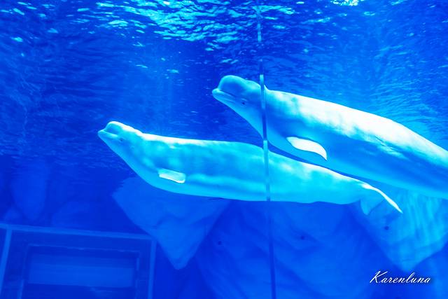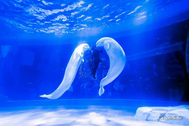 白鲸是我还没来到上海海昌海洋公园就一直心心念念想要看的动物之一。那高高的额头,天然萌的笑脸,通体白的纯净和优美曼妙的舞姿,简直就是鲸鱼里的白富美。他们时而在水池成双成对的转着圈,时而又相互嬉戏得玩儿着球。那微微上扬的嘴角,感觉无时无刻都不沉浸在快乐中。站在玻璃前,什么也不干,只是呆呆的看着他们的一举一动,心情便会莫名的变得开心起来。