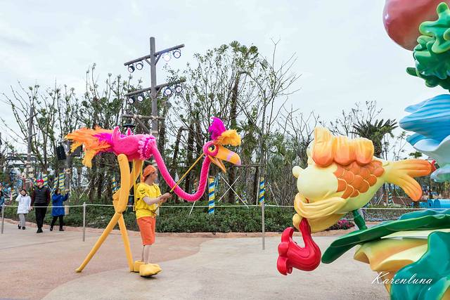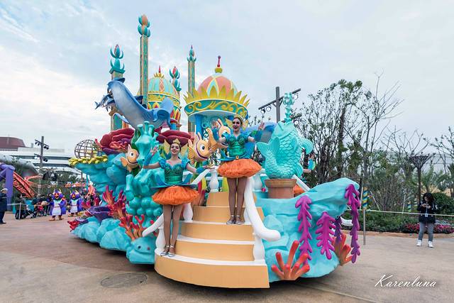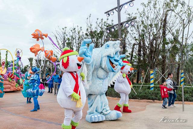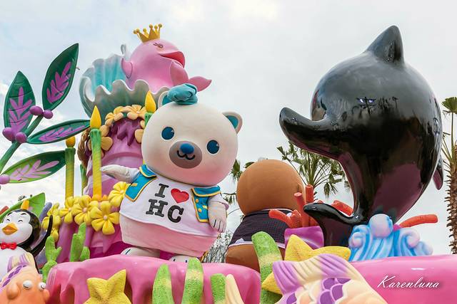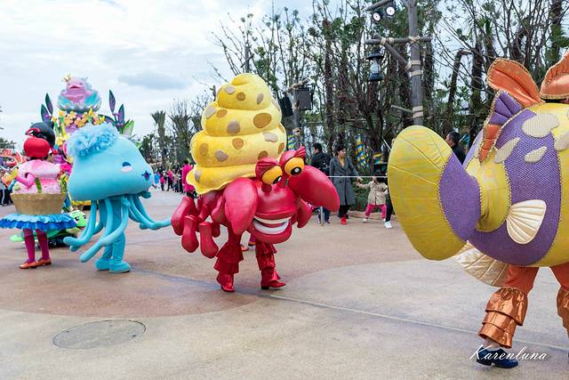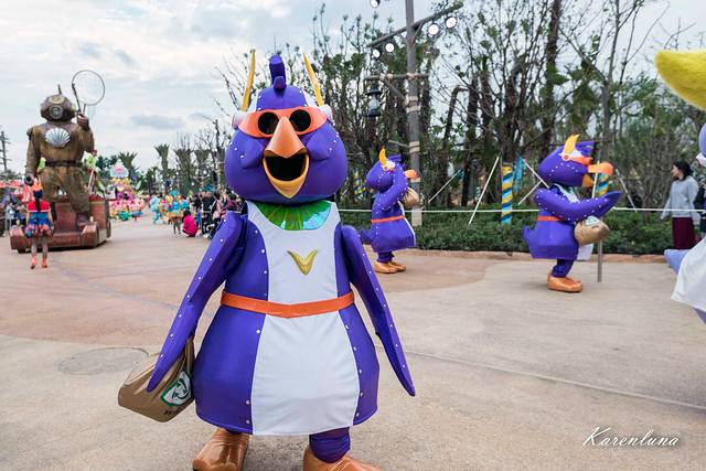 每辆花车上都会有各种可爱的人物形象与游客们见面。有冰雪王国的雪人怪兽、有长腿长脖子的鸵鸟,有漂亮的美人鱼,还有搞笑可爱的鹦鹉寄居蟹。