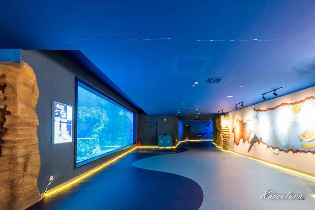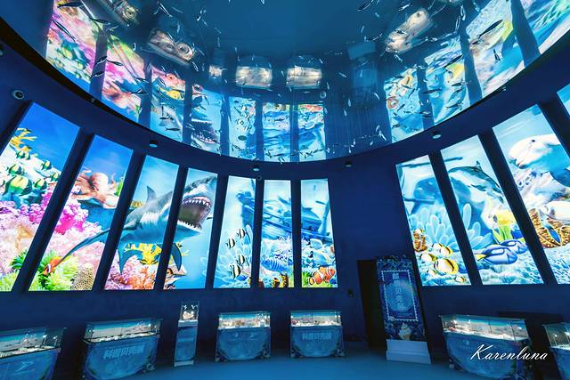 走进其中就被一个个一人多高的蓝色水族箱所吸引。就像一面面墙一样,一直向里延伸着。