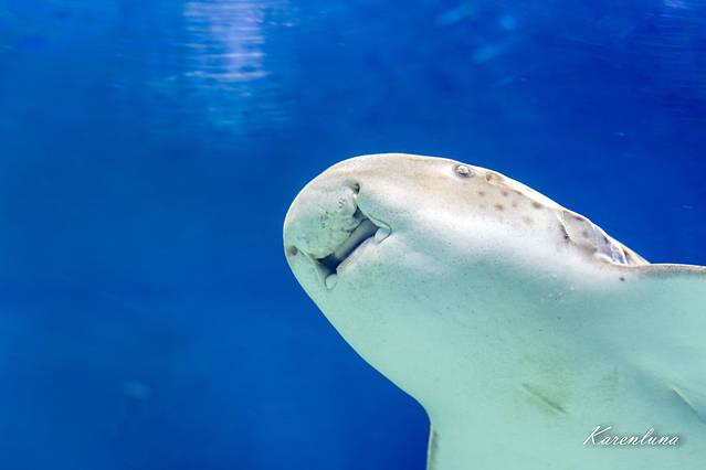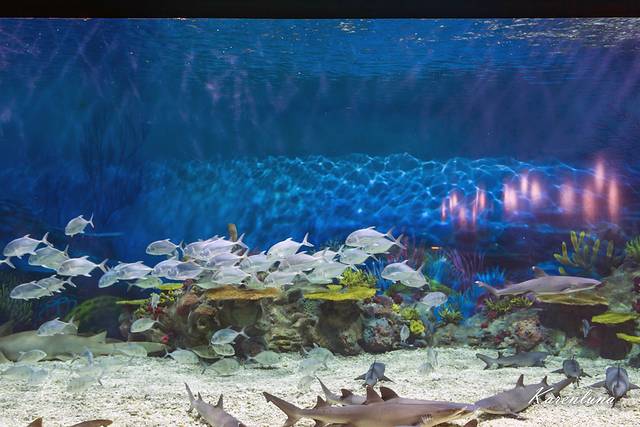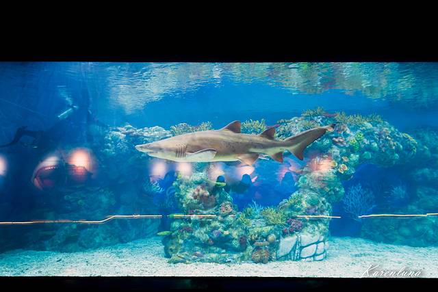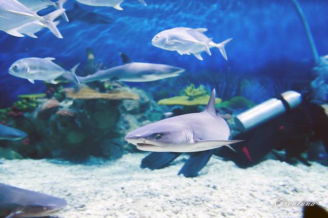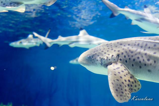 有的小鲨鱼欢快的游来游去,而有的大鲨鱼一直趴在水底一动不动,要不是讲解员的介绍,那隐藏在石头间的巨鲨与周围环境颜色一毛一样,真是分分钟略过。站在玻璃外,看着水里那一条条鲨鱼瞪着眼睛从我身边游过,透露出来的犀利与凶猛,还是会让我感觉到害怕。