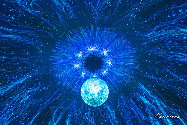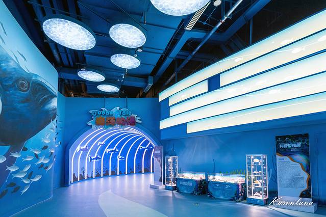 一进门就看到拱形的蓝色隧道设计。一圈一圈的灯光,像极了时空穿梭隧道,走过其中,仿佛来到了另外一个蓝色的世界。