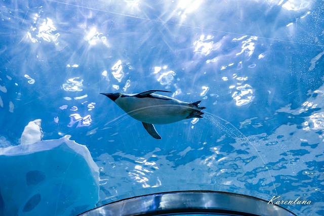 而在水中,一只只体型肥硕的帝企鹅正在快乐的相互追逐着。开始以为是圆柱型的玻璃有了放大的功效,让本来很小的企鹅看上去又大又胖。但当我仰望天花板时,却发现帝企鹅的体积远比我想象中大很多。都说帝企鹅是企鹅家族中个体最大的一种,今天终于亲眼见到了。
