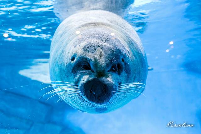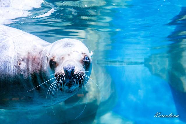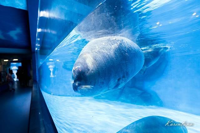 刚想离开这里,却被一只超憨的胖海豹吸引住了。不知道为什么,这只场馆里体型最大的海豹闭着眼睛,一直用鼻子怼在玻璃上,有点儿像犯了错误在面壁思过,即使偶尔会睁开两只圆圆的大眼睛看看周遭的环境,也会游那么两下,但最后也只是换个地方继续用鼻子贴在玻璃上。真是又傻又可爱。