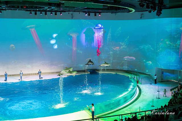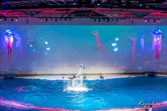 每天10点,在海豚馆里都会上演一部浪漫惊险的海豚表演。在彩色灯光与大型水帘的幕布下,海豚时儿从水中跃起,时儿将饲养员从水中抛出,时儿又萌萌的挥舞着其他的尾巴,憨态可掬。