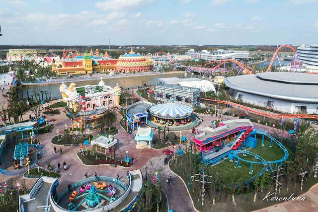 划过蓝天,俯瞰全景,五颜六色的场馆建筑各有各的特点,让人看上去眼花缭乱,充满着欢乐的气氛。