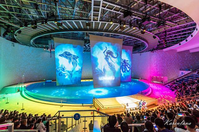 离开了珊瑚馆,继续往前走就来到了海豚剧场。此时的海豚正在被饲养员训练着,准备开始他的演出。