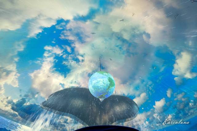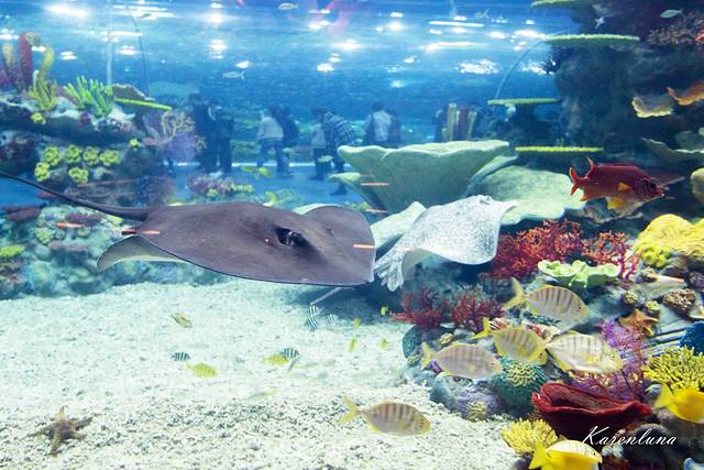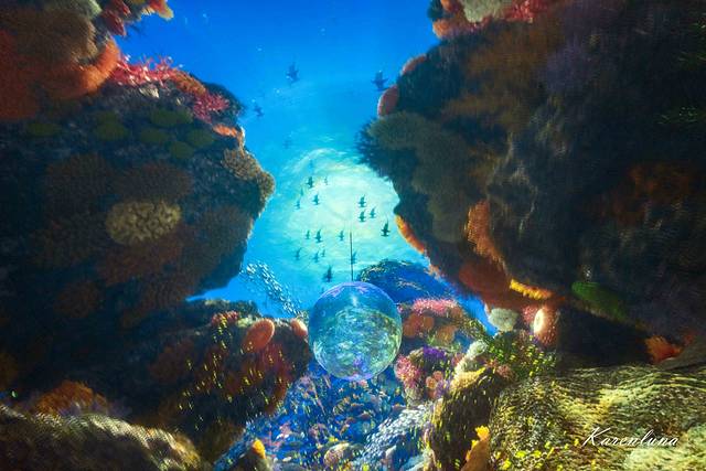 拱形的玻璃隧道让人仿佛置身于水下世界,海龟、蝠鲼、鱼群自由自在的在人的左右上方自由的翱翔,时儿穿过茂盛瑰丽的彩色珊瑚、时而又好奇的游到隧道边好奇的Say Hello。早上应该是动物们“吃早饭”的时间,在这里同样看到了潜水员在水中喂食,成群的鱼把饲养员团团围住,里三层外三层几乎可以说的360度全方位包围,不仔细看真的看不出来那是一个人。