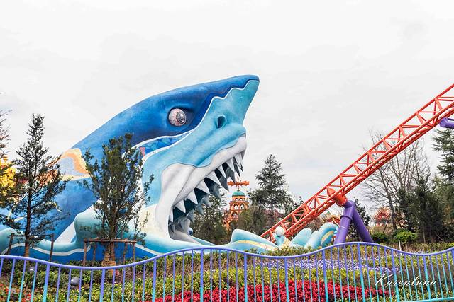 走进园中,最先映入眼帘的便是人鱼海湾里那巨大的鲨鱼头。