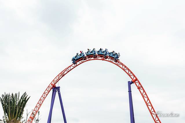 巨大的鲨鱼嘴里一个橙色的过山车铁架从中而出,当过山车驶过时,就像是直接驶进了鲨鱼的肚子里。正在寻找过山车的铁路尽头,就看到一辆小型的火山车正巧驶过河对岸的最高点,那此起彼伏的尖叫声真的是此起彼伏。这个比一般的要大好几倍的过山车居然横跨了公园里的大河,没想到海洋公园里还有如此刺激好玩儿的游戏。