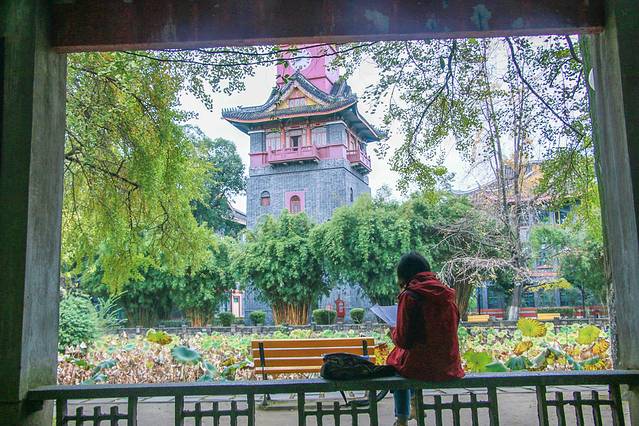 古老的校园,屹立的钟楼,宽阔的荷花池,晨读的学生。