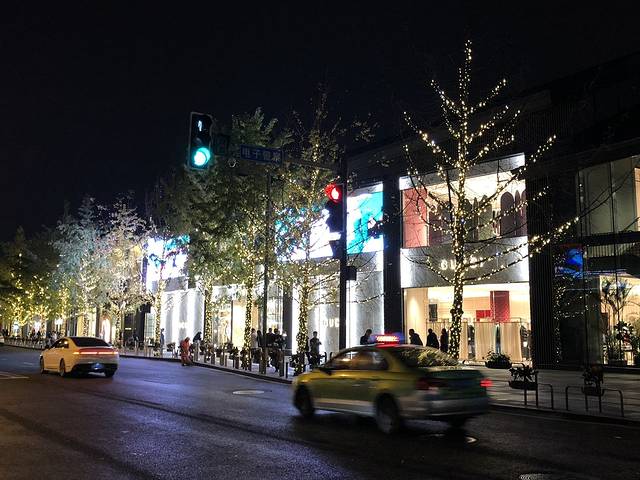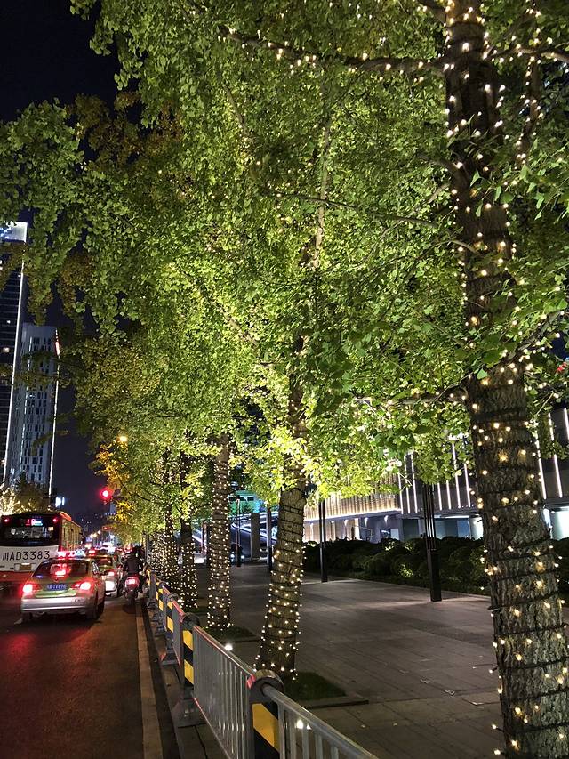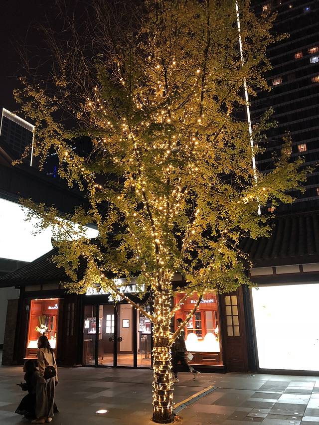 在时尚的春熙路路边,也有一些银杏树,挂着灯光,夜色中也格外亮丽,连古树也赶起了时髦。
