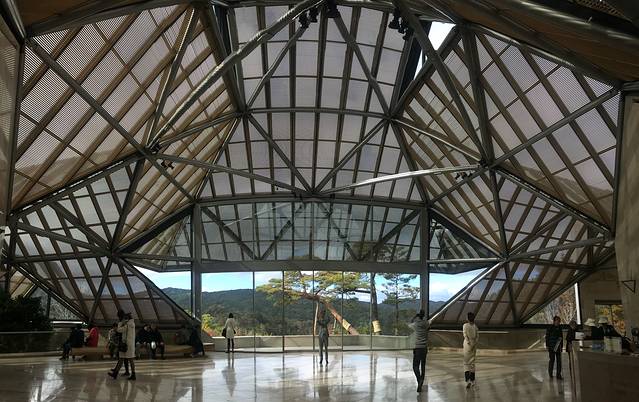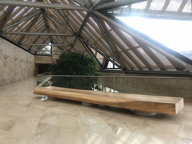 一进门,只见一个巨大钢结构玻璃穹顶,阳光透过异形玻璃窗在室内投射出各种几何形状,落地窗外一棵硕大迎客松。在之后的参观过程中发现,每个展馆,无论地上还是地下,都有类似的几何结构落地窗,和大师最知名作品巴黎卢浮宫玻璃金字塔类似,不过看了这片建筑,真的感觉巴黎那个有些违和。