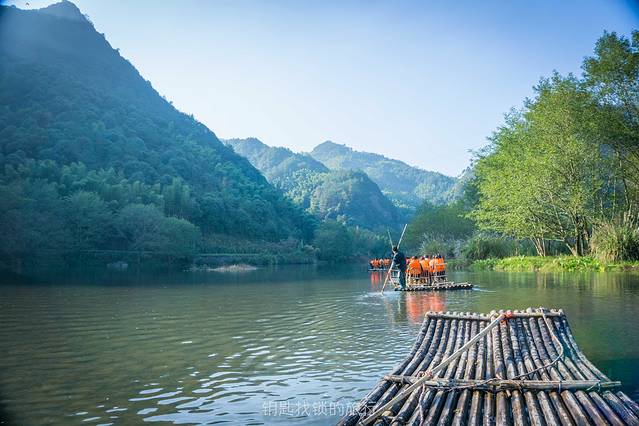 漂流路线总长约2.8公里,从起点出发,沿灵山江顺流而下,两边郁郁葱葱的群山倒影在江水里,碧水映青山,水在山里流,山在水中映,让游客感受美丽乡村石角村的独特美景。