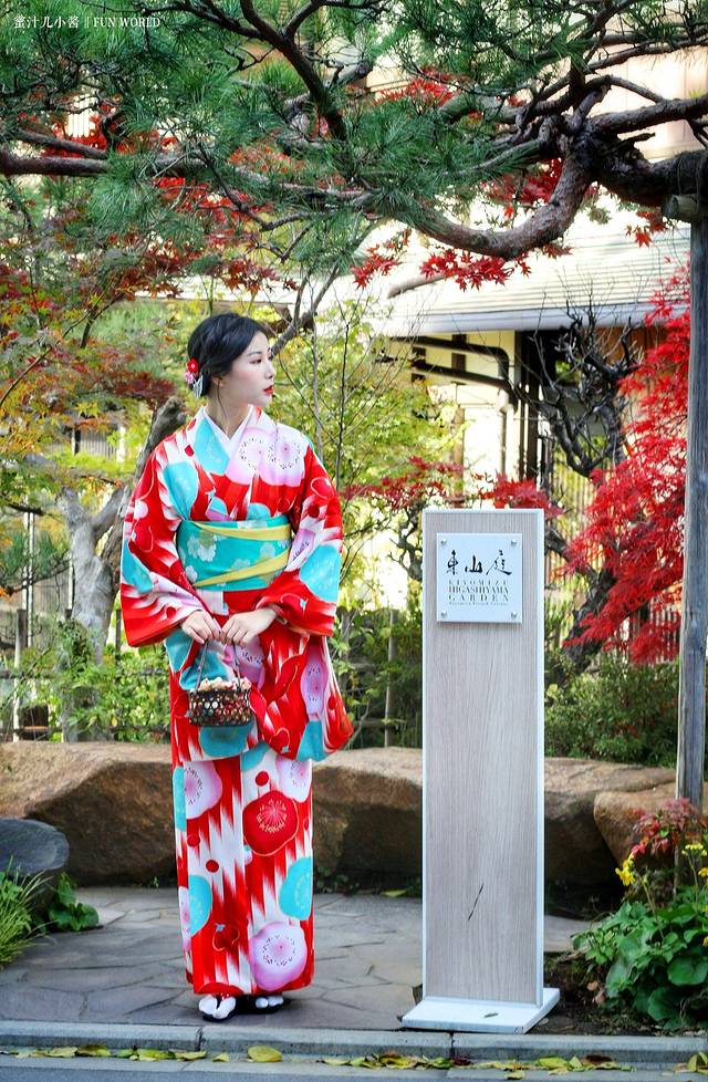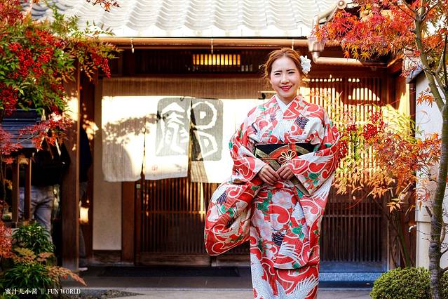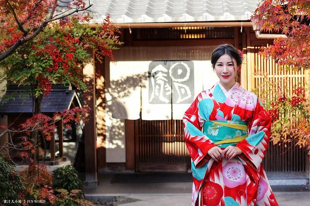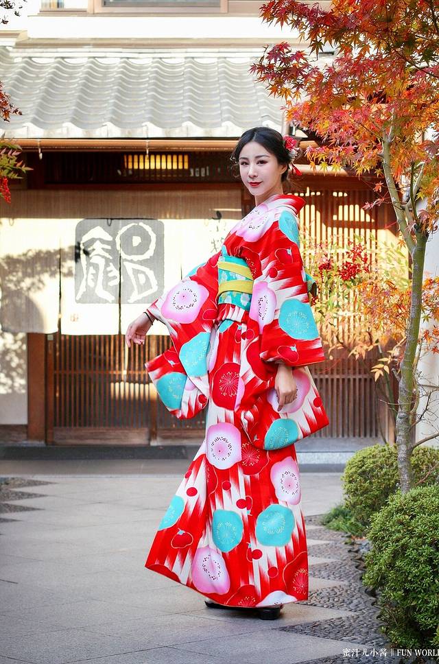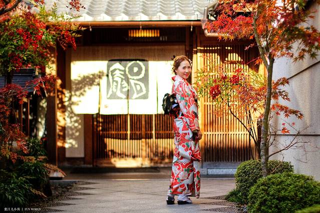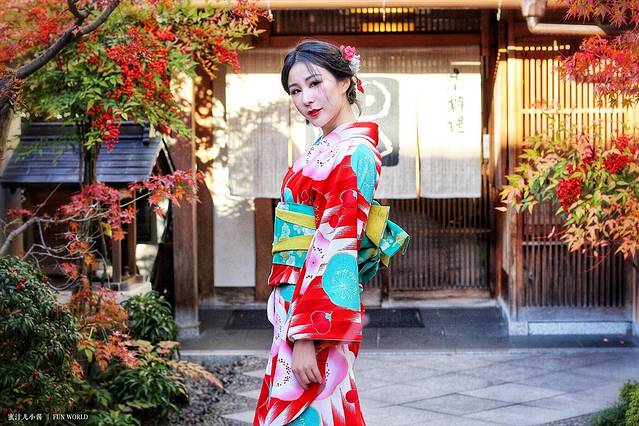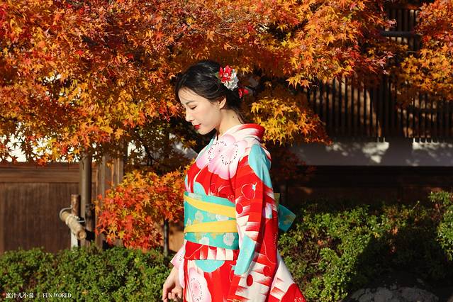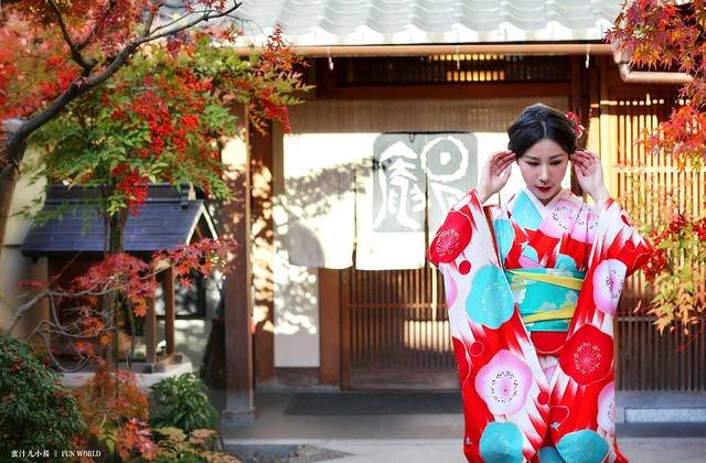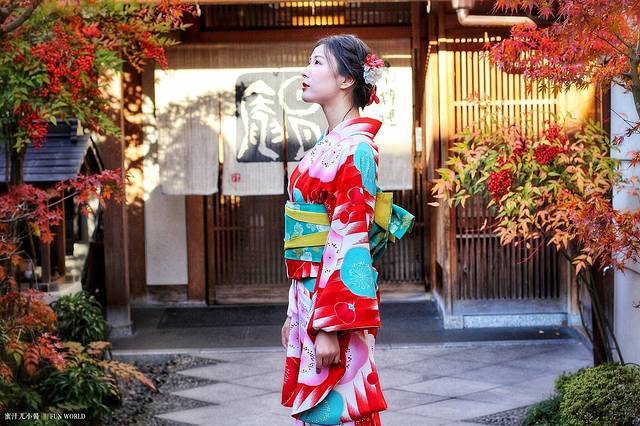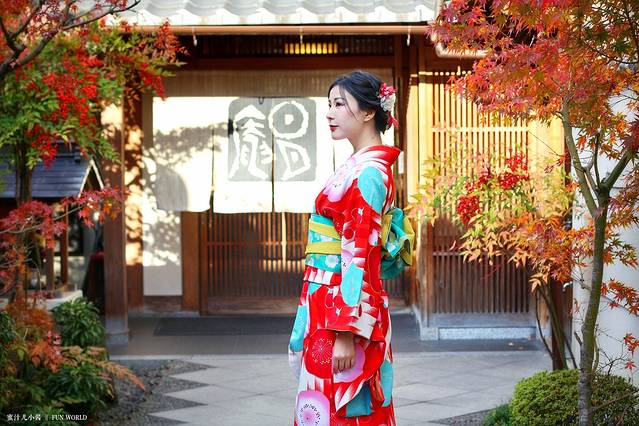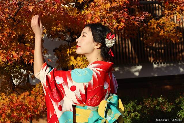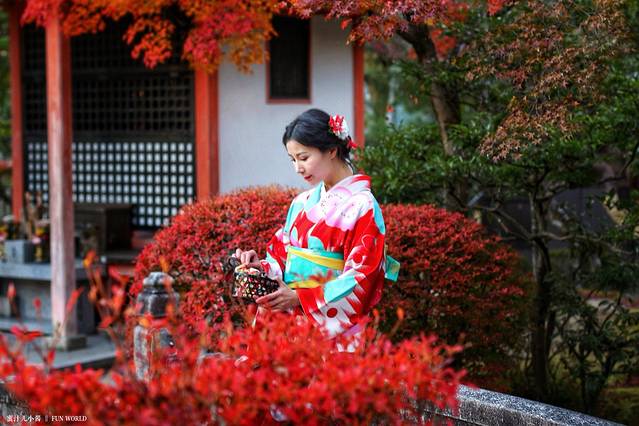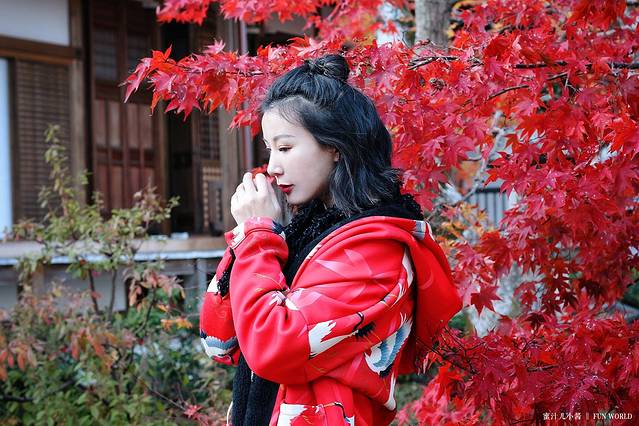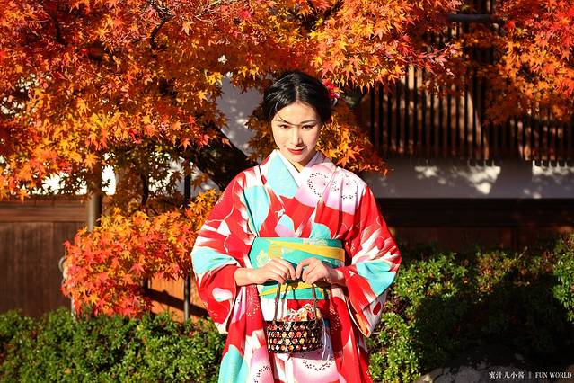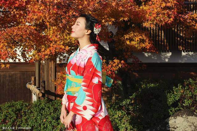 虽说 京都 的秋色缤纷,不过占视线里绝对主导的色彩依然是红色和黄色系:火红、绯红、猩红、橙红、橙黄、金黄、藤黄、琥珀……秋季天渐冷,万物似乎都自动翻转到了暖色调,给人抚以温暖的慰藉。这时和服的颜色,千万不能选择冷色调,粉嫩色系与枫叶高纯的色度也十分不搭(粉嫩色系适合樱花和紫藤季)。尽量选择暖色系,以及服装色彩里有部分跟枫叶色彩相呼应的颜色。这样在拍照时,才不易被鲜艳的枫叶抢了色去。如果喜欢成熟的风格,主视觉黑色,装饰色红色、橙色的和服也是不错的选择。总结来说,避开色系冲突的冷色系、粉嫩色系,根据自身风格和偏好来挑选就可以啦~