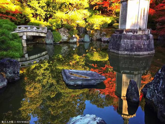 至于哪一处的风景最好?蜜酱非常偏好弁天社、锦云桥、放生池一带,寺院在这池塘附近还贴心的放上了观景座呢。下图这个场景便是蜜汁儿在永观堂里最喜欢的:锦云桥、放生池、红黄枫叶相映成趣,实景比照片里美数十倍不止(回程必经一座极乐桥,也是看这个景的最佳视角,所以人超级多,工作人员一直在旁边疏导行人不能在桥上停留,所以这照片是在行走的过程中匆匆抓拍的,拍成这个渣画质实属无奈。因为蜜酱太喜欢这个景也就保留了下来做个念想)。实际看到的场景真好像张艺谋导演电影里的布景一样,美得那么艺术……