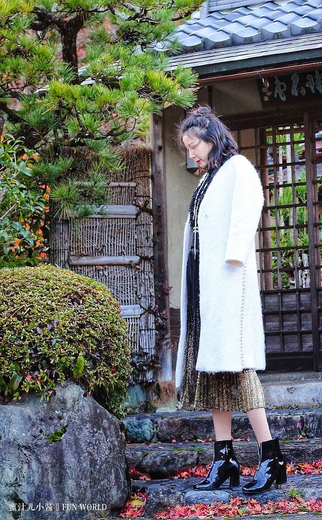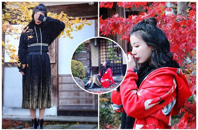 内搭:有朋友可能会问,都红艳艳的,不会红到一块儿去了吗?此时,内搭就很重要了!在里面可以搭配一套纯色服装。蜜酱内搭便是搭配的黑色毛苏上衣,下身搭配的黑色蕾丝质感长裙,裙下摆有渐变的金粉装饰。选择这套的原因是上身毛苏上衣绒绒的质感与深秋寒冷的 日本 更加匹配,下身的金粉过度长裙恰好与枫叶的金色有呼应。根据不同场地的风格和颜色,这套衣服即可以单穿,也可以做为红色外套的内搭。 岚山 的色彩偏丰富绚烂,所以,准备一套颜色艳丽的外套,再穿一套美美的内搭实现风格转换正好。蜜汁儿在下山途中的一所 日本 民居庭院前还搭了一件纯白色外套拍照(照片楼层:【 岚山 】),风格更清新一些,不过蜜酱更喜欢红色在画面里的点缀。来看红叶,那就和红叶一起红下去,哈哈~~~
