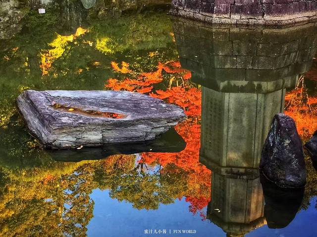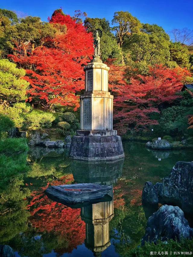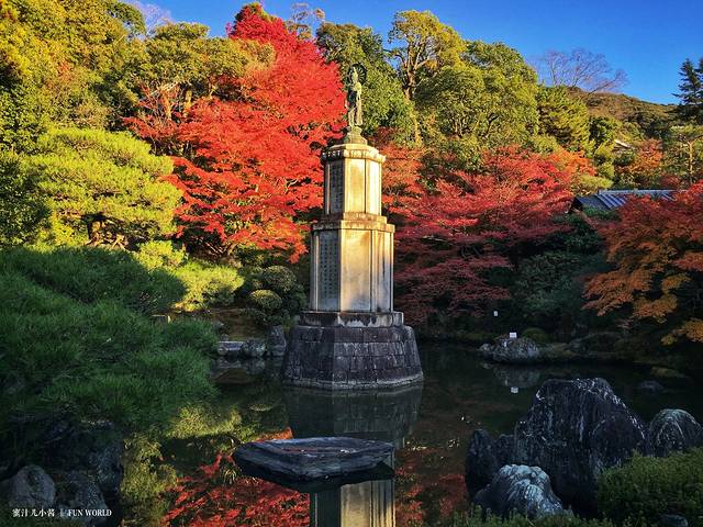 我们往回走时,在方丈庭园觅得一处精致的秋色小景。一尊佛像树立池中,周围艳红,明黄,翠绿环绕,将秋天的颜色诠释得如童话一般。池水颜色碧绿,反衬得平静的池水像一面镜子,将秋日色彩换种方式演绎出来。我挑了池边的一块石头坐下,静静欣赏这难能可贵的秋景。不一会儿,太阳被云层遮住,眼前这般景色像被褪色一样,失去了 光泽 。我继续等着,坚持太阳总有出来的一刻。一瞬后,这幅丹青被一点点晕染出愈加靓丽的色彩,神奇一般地,看着太阳为它重新着色,它又像被赋予了灵魂一样,活脱过来,充满了生机……