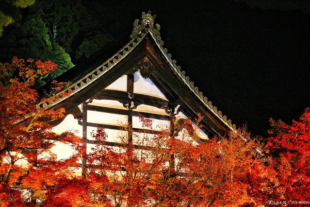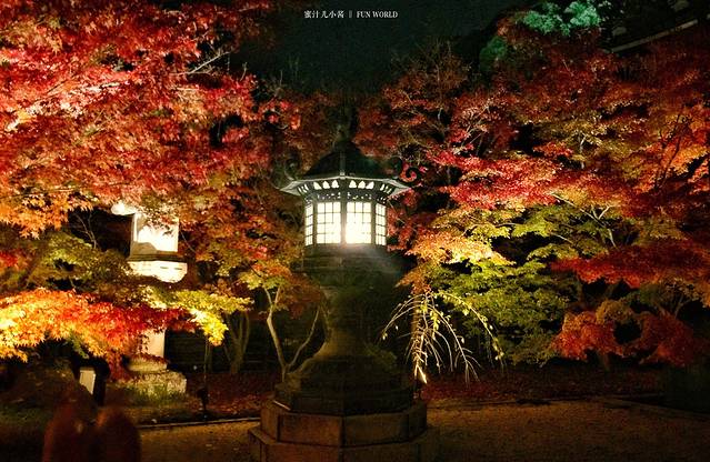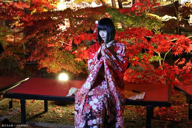 由于夜间对摄影的技术要求实在高,作为菜鸟的我们有着深深的自知之明,而且永观堂的灯光并不明亮,主要以渲染枫叶为主,可想而知这拍照难度。所以我们仅拍了些枫叶,整个游览过程以欣赏为主。不过,对于夜间拍照这事儿永远不缺乏挑战者, 比如 下图便是一位穿着和服的 日本 妹子,请了摄影师专程来拍片,由此吸引住了众多目光,当然,也包括我的。话说这位 日本 小姐姐挺美的呢~