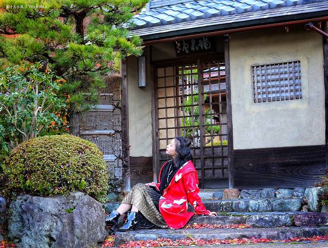 往清水寺方向行去,在主道的左手边有一条小巷,最里处是一家传统饭馆,建筑很有日式风情。两旁的树木已是覆上了秋天的红色橙色,灌木丛和一些树叶依旧保持着常青的色彩,这个巷子就在主道旁,却完美躲过了拥挤的人潮,闹中取静一般。于是,我和闺蜜诗苑便开始了包场拍摄……