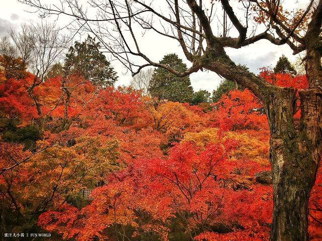 在洗玉涧溪谷观赏枫叶这一带中,通天桥是观赏红叶的最佳地点。同样,不可置否的当然是人也最多。所以我们在通天桥欣赏完红叶后,人像的拍摄都错开了这里,而是在偃月桥附近完成的。(Tip:东福寺是不能踏入草坪内拍照的,所以想拿本书坐在枫树下装装文艺是不现实的 ,从蜜酱的照片可以看出,院里的枫树比较矮,这样的高度正适合拍人像。而且这里的枫树枝叶茂盛,一些枝节会野蛮生长跨出禁区,所以我们可以站在外面,利用外围的枫叶营造出身在其中的感觉)。在这里,不需要借助外界的道具,枫叶,就是最好的拍照道具 ^ . ^