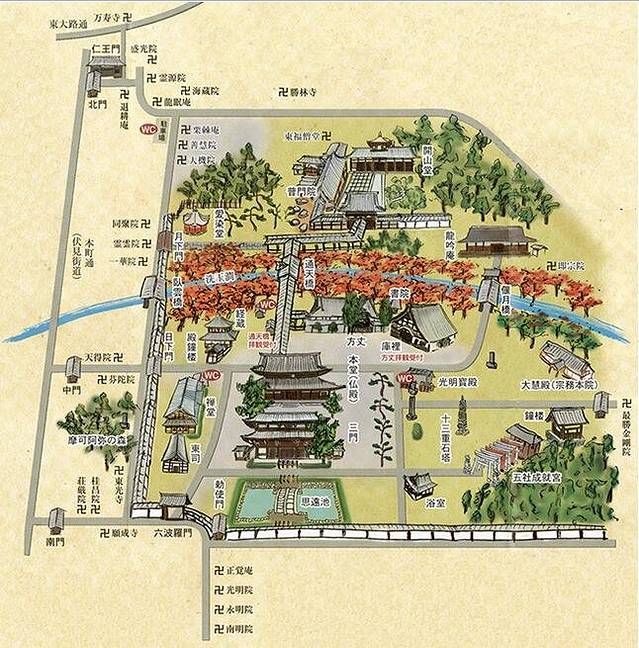 作为 京都 最大的禅寺,东福寺也是临济宗东福寺派的总院,占地面积达到20万平方米。附上是东福寺的全境地图: