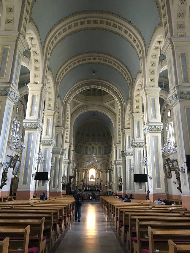 天津西开教堂建筑平面呈拉丁“十”字形构图,三个高达45米的巨型圆顶错落排列成“品”字形,三座穹窿顶均略向上拉长,表面以绿色铜板覆盖,巨型圆顶为木结构支撑,每座圆顶上有一个青铜十字架。