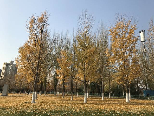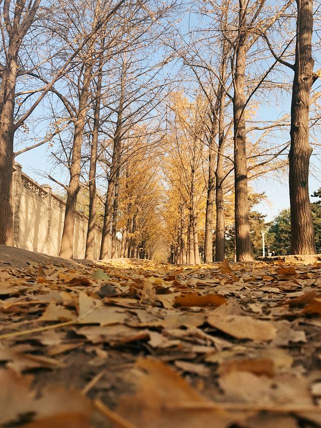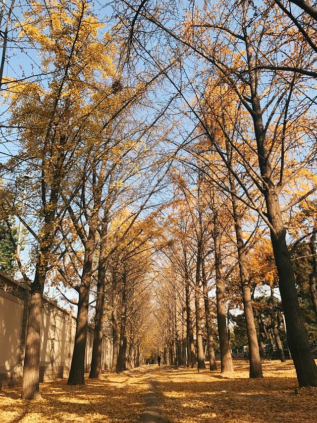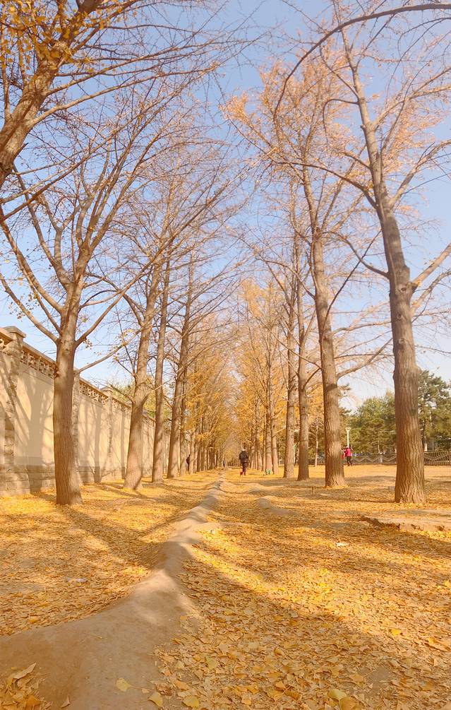 北京地区的银杏种植历史比较久远,以钓鱼台银杏大道最美最有名,据说这里的银杏是北京最早种下的一批,比起日坛里的更加密集粗壮。