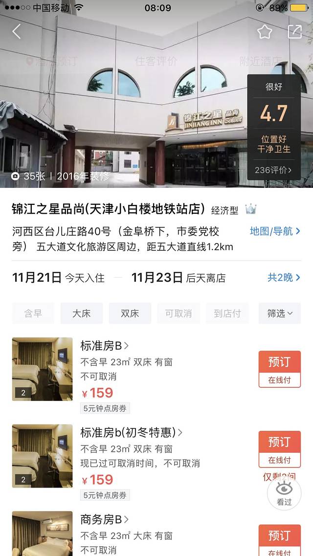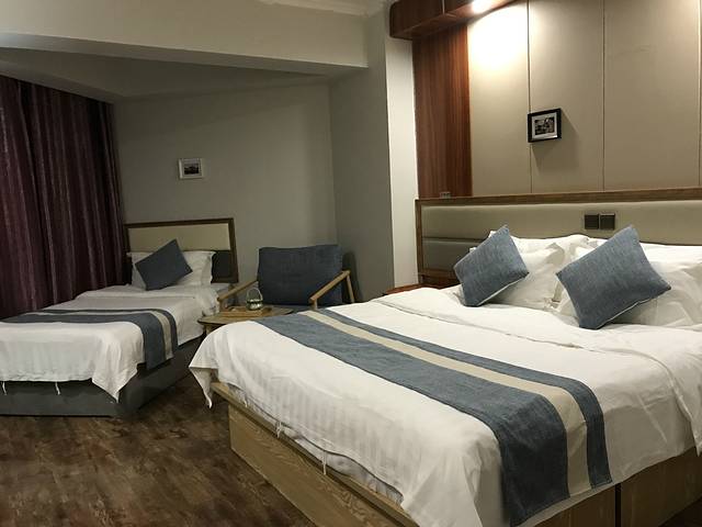 酒店环境很不错(离我想去的景点都比较近),房间很干净卫生,交通很方便,出门就是公交车,订了三晚,259元/晚,标准双床房(部分有窗),办入住时前台安排我们住3楼,一进门就觉得很闷,要求前台换房间,后来换到6楼,这是三人房,还有窗户,真的很不错,美团预订的所以前台说免费给我们升级,所以没有另外再多收房费。