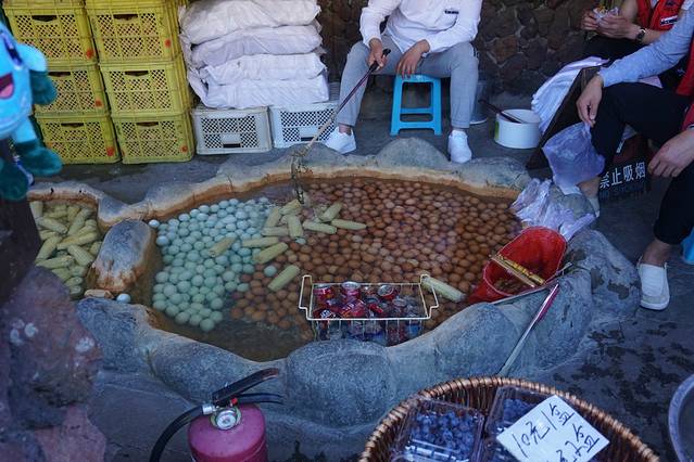 著名的“温泉煮鸡蛋”,利用这里的高热温泉可以将鸡蛋煮熟,蛋黄凝固紧实,但蛋清成软体果冻状。同时还有鸭蛋、玉米等