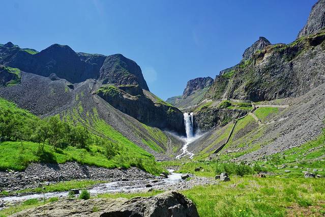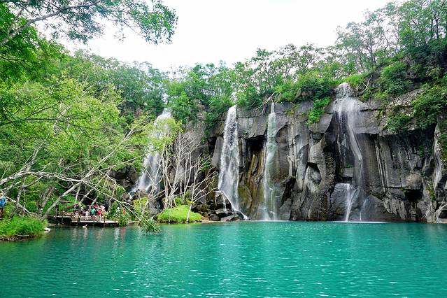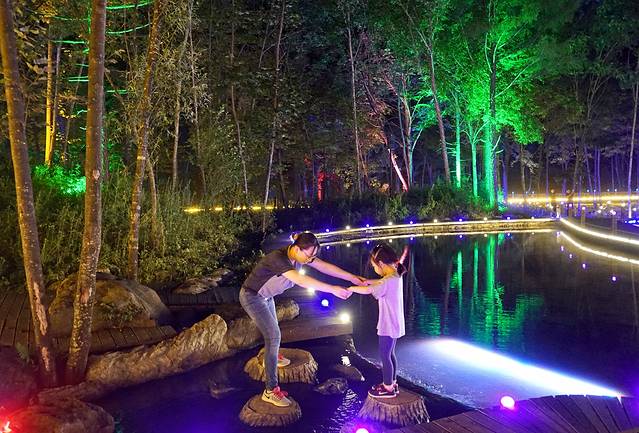 栈道终点,视野突然开阔,地下暗流也重见天日,这里便是绿渊潭停车场,过到对面马路下个坡就是绿渊潭。
