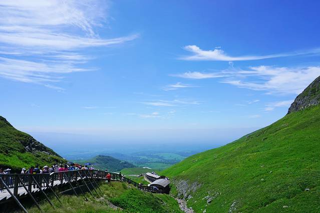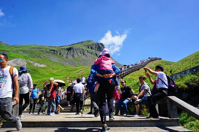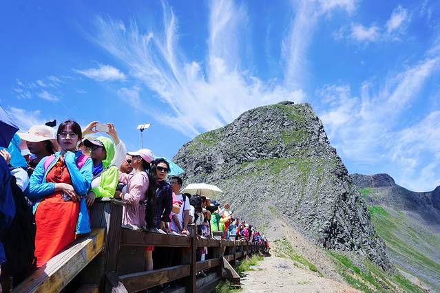 环保车抵达天池站,下车便感受到了海拔带来的凉意,接下来就是1442级台阶啦。此刻天蓝风轻云淡,抬头望去,木质台阶上形成一条移动的人龙,感觉并不是很高很远,但毕竟算较高海拔,行动不便的游客可以选择人工抬轿,价格上山400元/人下山300元/人。