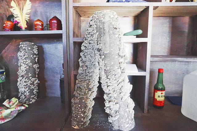 挖参过程称作“抬棒槌”,他们会用拴有铜钱的红绳套在参叶上,不了解挖参的我们其实通过影视剧作之类的也能想象出这是为了“锁”住人参不让它跑走。屋主告诉我,除了这层意义外,这样做的目的也是为了做标记,告诉其他采参人,这株参已有主了,如果人参还没长成,红线可以防止它长歪。抬棒槌的过程并不简单,采参人要用鹿骨拨开土壤,用苔藓、树皮进行包裹,以示对这种神奇药材尊重。