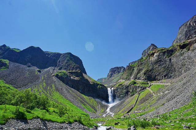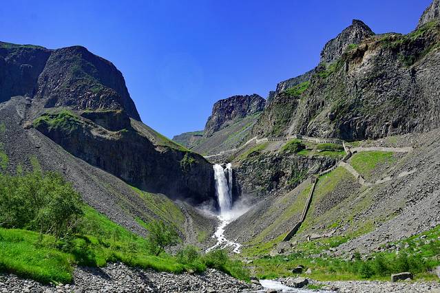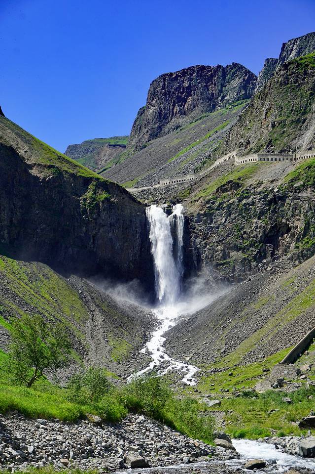 在瀑布边的峭壁上有一条石头修建而成的隧道长廊,远观似长城的城墙,近看形似隧道,墙壁上有方形孔,期初还给小伙伴发消息开玩笑询问这是否便是通往青铜门之路,后来得知这里曾经是通往天池水边的道路,一路上能近距离观看长白山美景,更能亲手触碰山上流下的泉水,长廊于2008年时因山雨造成滚石塌方,长白山当地为了安全起见,同时也是出于保护水源的考虑,封闭了该条长廊。