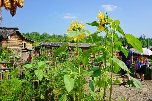 放山人家前的向日葵。说好的向阳而生呢?两株向日葵却面朝不同方向,结合右边人的倒影,两株向日葵均不面向太阳,也是很任性了!(笑哭.gif)