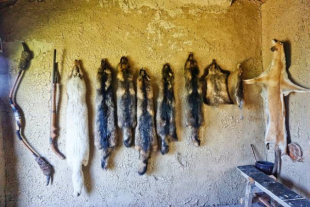 相较于探访的其他几户人家,猎户人家已没有居民生活,屋外还悬挂着“卖房”信息,进门入眼的便是动物的皮毛和狩猎工具,狼、狐、野兔等等,伸手去感触不同动物皮毛,印象中狼毛偏硬,手感最好的当属狐毛。