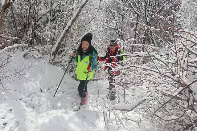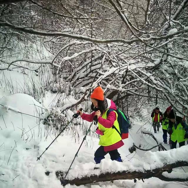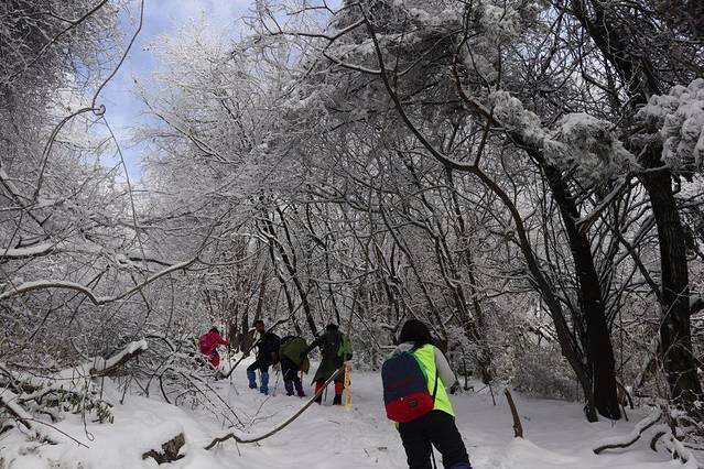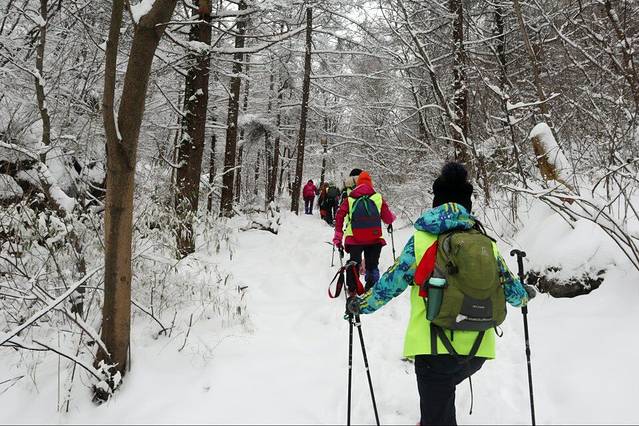 18日早上7点30分等到人都到齐了以后我们就一起包车(领队提前联系的)去光头山。一路上全都是蜿蜒的山路,刚开始大家都在补觉,大概一个小时之后,从车窗外往出看,全都是雪的时候大家都差不多醒了,全都往出看,虽然说冬天已经到了,但是市里面还没有看到过雪,所以看到雪还是比较激动的。在9点过的时候我们到达了山底,然后我们就下车开始带雪套、穿冰爪准备着去爬山了,山上积雪较厚,垃圾都被埋在雪下面了一路上很少看见垃圾。