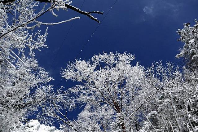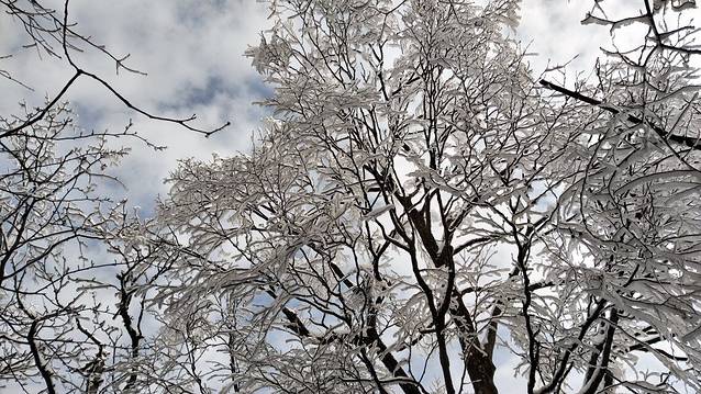 由于光头山一直是在拔高,好久没有爬过山了,刚开始走的挺快的,慢慢走着就感觉到有些喘,也许是体力不支的原因,也许是高反的心理状态,走起来需要走走停停再喘喘。刚开始爬的时候就感觉真的是进入了白色的童话世界,地面是白色的,树上也是白色的,枝枝条条上挂满了雪。雪并不是轻轻的覆盖在上面,而是结结实实的包裹着树枝。在树林里穿行,真的犹如在白色的童话世界里穿行。