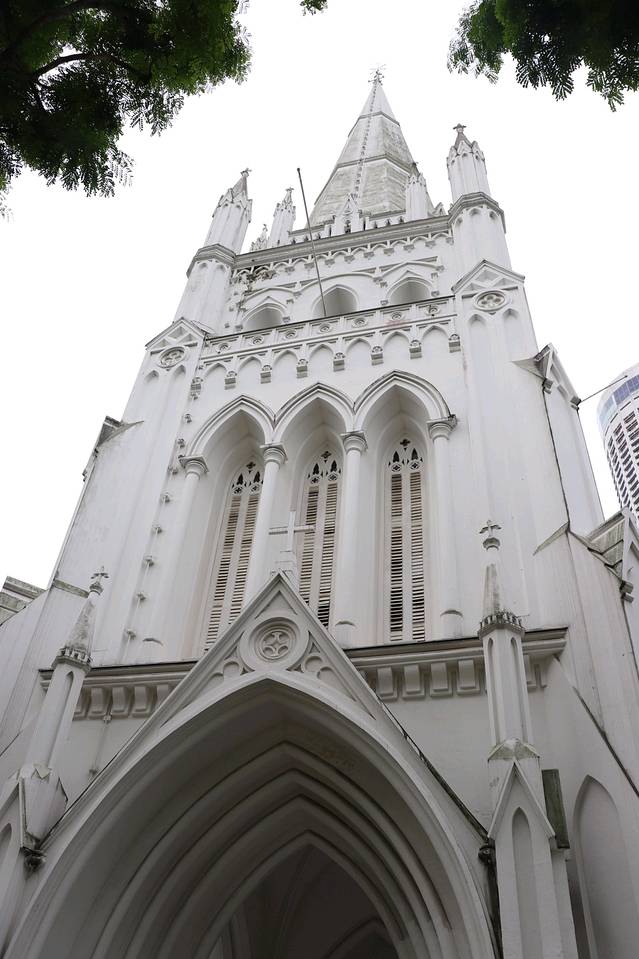 赞美广场不远处就是圣安德列教堂。这就是新加坡最著名的一座教堂。 洁白亮丽的外墙是圣安德烈教堂最傲人的特点之一。据说是将贝壳磨成灰,加入蛋白和糖调成糊状,再放入浸泡到柔软的椰子壳,就制成了一种实用又美观的石膏。将其涂在建筑的表面,不容易出现裂痕,而且洁白有光泽。