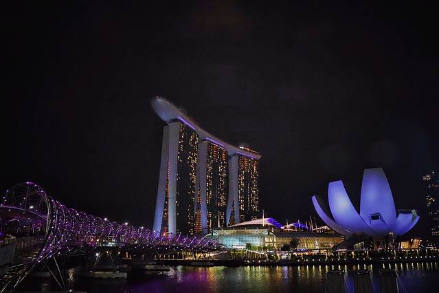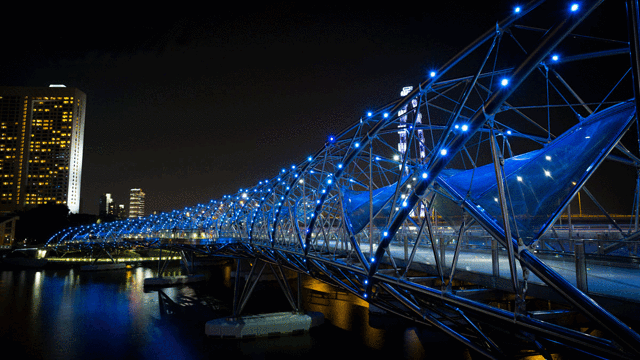 说回新加坡双螺旋桥,它是世界第一座人行螺旋桥。且它的材质是由不锈钢建材而建成。长约两百八十米、宽为六米。桥的对岸是著名的金沙酒店。桥中间有个圆形瞭望台,供人们休息和欣赏风景。