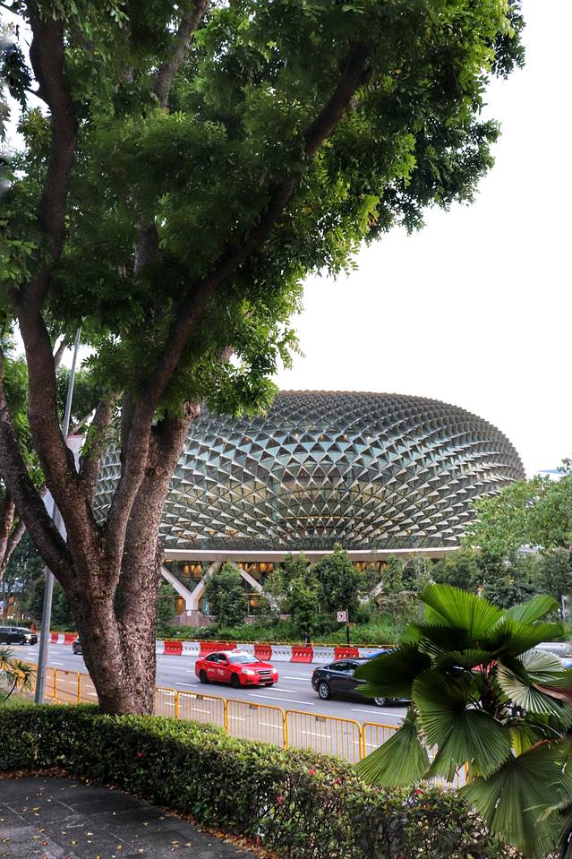 出了地铁,一眼变看见了榴莲形状的新加坡歌剧院。这预示着我们就快走到海滨湾了。一旁的雨树也是长势貌盛,雨树是新加坡道路景观中运用的最多植物。