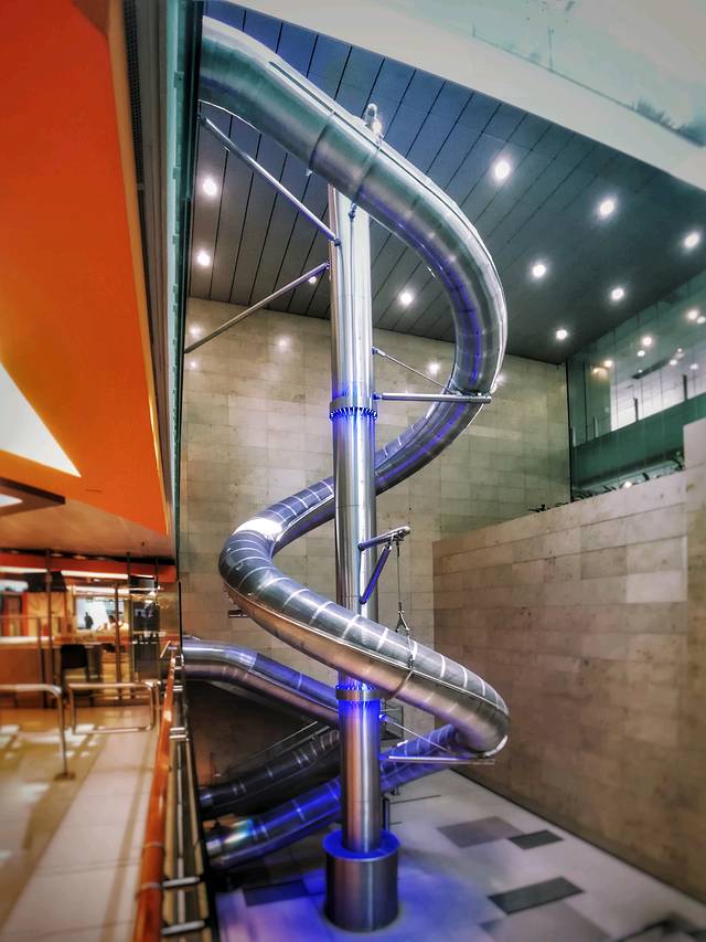 该滑梯在T3,中午12点才开放,滑梯有四层楼那么高。拍摄时我站在二楼拍摄。所以看上似乎并不是特别高。