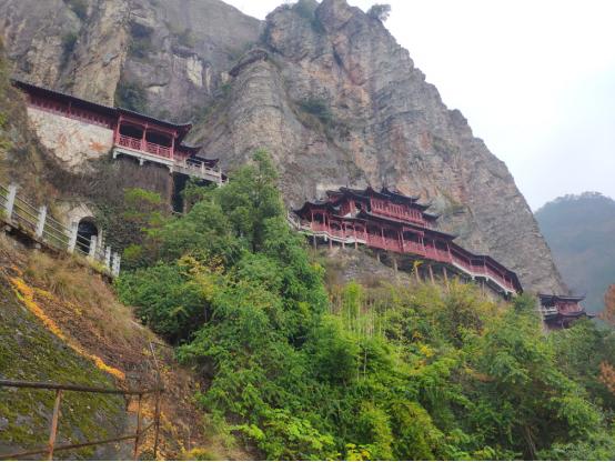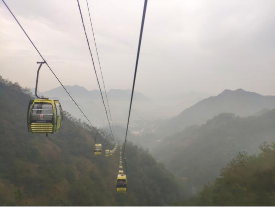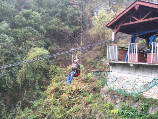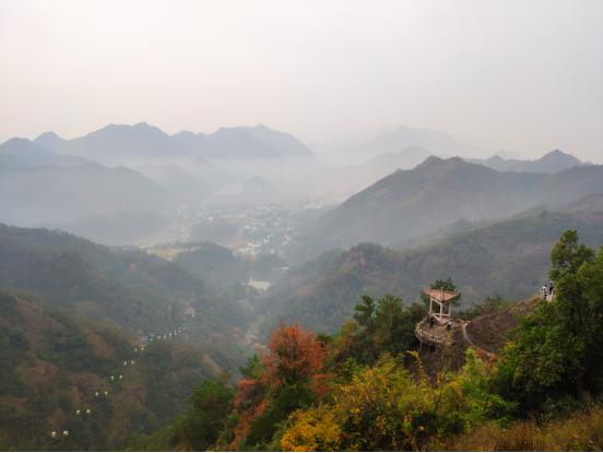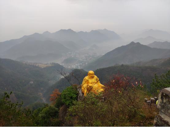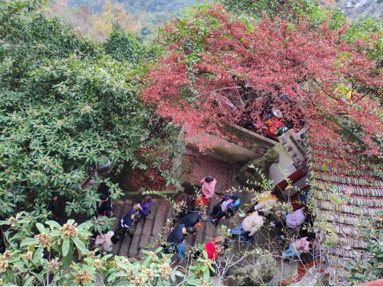 哪怕我们已经坐了缆车少走了很多路,但是离山顶其实还有很远。大慈岩爬山很累,上上下下很曲折,而且为了刺激有些地方是镂空的,有惊无险,也算乐趣,但是恐高的人得好好考虑了。我们走了很久很高,最后一览众山小的感觉还是不错的。雨天很闷,我们又穿着密不透风的雨衣,所以脸上出了一层汗,脸很红,但是上山很阴冷(也可能是天气的原因)怕感冒,所以衣服还是穿着不敢脱,建议爬大慈岩的朋友可以轻装上阵,但是一定要带条外套。大慈岩最顶峰有一颗千年银杏树,秋天很多人都是为了拍它而爬上来的,但是可惜在我们来的前不久刚刚掉光,拍了个寂寞。旁边是新开的玻璃栈道,但是人太多,我们就不去试试了。我们下山时是坐索道下的,30元每人,看着比较刺激,但其实还好,索道不长,也就一分钟不到,剩下的路还是要自己走下去的,索道更多是一种体验。