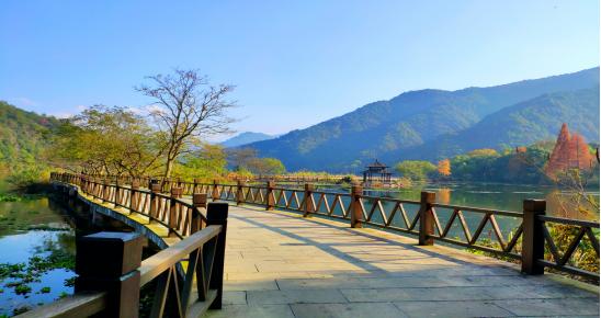 一路上我们几个小伙伴走走聊聊天,偶尔吃点鸡爪梨,导游在前面介绍建德的过往历史和当地的特色美食,也很有滋味,走了大约一个半小时,才到了绿道的第一个休息点,我们打算不继续走,直接回去了,因为绿道是单行道,回去要走回头路,走路看风景看过一遍是享受,再走一遍就是遭罪了,所以我们就直接坐观光车回去了,20元一人。休息站也可以租自行车,价格是20元一小时。