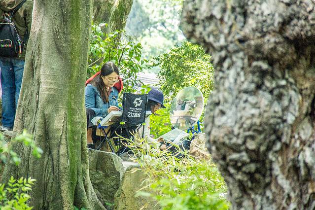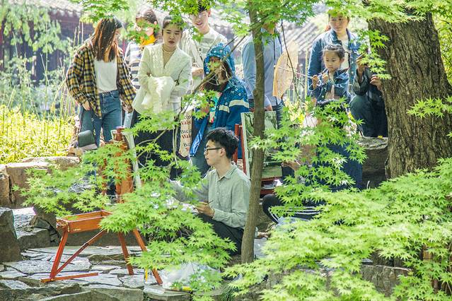 即便是非周末,拙政园依然游人如织。不过,比游人还要多的,恐怕要属画家和摄影师了:一步一景,于是每走几步就能遇到在河边静静作画的人,引得游人围观。这也是其他时候来拙政园很少遇到的现象。