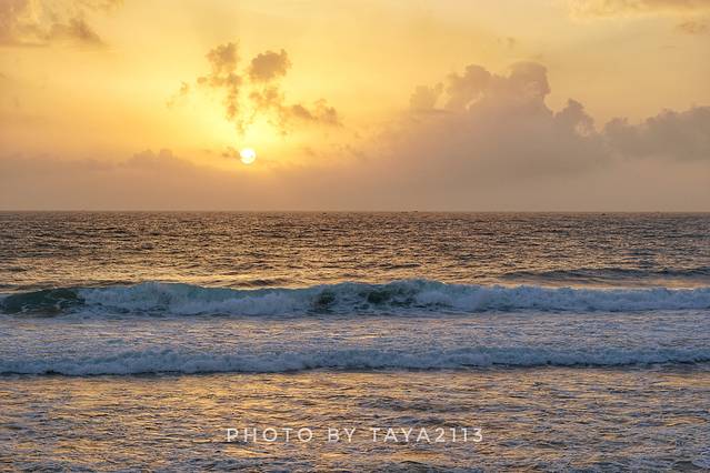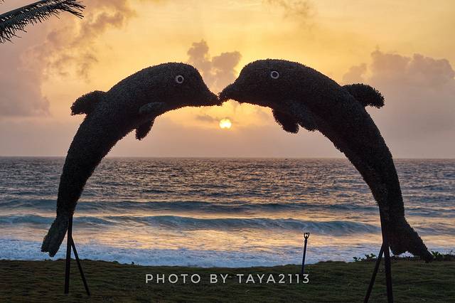 凌晨6点的香水湾,空气清新,温暖微咸的海风轻轻的吹拂着,温柔的让人沉醉,仿佛连海浪都放慢了脚步,声音都轻了很多,此时的天空还显的有些昏暗,光从云层后面慢慢的透出,海岛度假,日出是必须要看的,当你看着一轮红日从海平面升起,如鲜花绽放,如水波四散,染红整个天空,那种壮美,会让你心中感触油然而生,大赞一声大自然的美!一如昨晚,云层偏厚,略微有些失望的我没有叫醒还在沉睡中的母女俩,独自换上运动鞋出门打算去跑个步,在入住的时候,酒店服务生给我一张慢跑径的地图,这是一条长度为2.5公里的慢跑径,沿着香水湾细软的沙滩而建,也串联起了万豪酒店的北楼和南楼,今天让我先去探探路。以为自己起的很早,刚到花园,就看到花园里有一群阿姨正认真的打着太极,到了慢跑径上,也已经有零星几人在跑步,中外皆有,果然锻炼是全球通用的语言。尤其是在这里温度适宜,空气清新,一边是海浪在伴奏,一边是绿地鲜花娇艳,慢慢的跑动,微微的出汗,实在太舒服了。咕咚运动记录下来,我花了1.2个小时,跑了6.1公里,慢如乌龟,其实呀,原因有二:一是当我以为今天的日出和我无缘时,在我跑到中途的时候,发现了2个海豚的雕像,而这时,云层出现了一个空窗,太阳如同一个娇羞的少女露出了害羞的笑脸,红扑扑的,边上的云彩大哥也太腼腆了,这么好的机会没把握住,居然害羞的悄然退去。整个东方的大半个天空红彤彤的一片,波光粼粼海面,反射着金红色的光,好像一幅水彩画,美不胜收,路过的游人忙举起手机拍摄,要把这美妙一刻留下来,分享给更多的人。二是沿途有很多小规划,巧妙和谐的融入,给整个慢跑径添色不少,树枝打造的英文字母,彩旗飘扬的儿童拍摄台,海边瑜伽营地等等,如此这般,让我的脚步跑跑停停,反倒是我的相机比我跑的远,因为它就一直没停过。