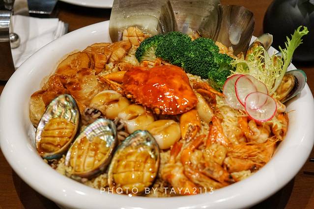 八鲜过海:即是主菜,也是主食菜,采用新鲜的蟹肉及瑶柱炒米饭做底,覆上麻鱼肚、鲜鲍鱼、基围虾、鲜带子、青口、乐膏蟹等八种海鲜,再浇上秘制海鲜浓汤,味美香浓。问妞儿什么最好吃?答:米饭!