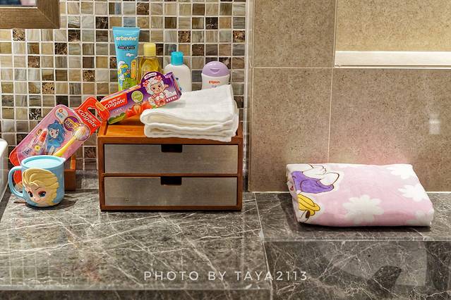 小床靠着窗,上面有2只玩偶温馨的排排坐,恬静的欣赏着窗外的美景。窗外是精致的热带园林,小花随风摇曳,远处是美丽的香水湾,浪花哗哗的歌唱,半躺在小床上,边上的小桌子上,是抵挡不住的诱惑,各种水果、甜点,加上刚刚的特饮,分量多的可以开个一个小派对了,酒店果然是大气,我就不客气先享用一点,舒服一下,以安慰我被刺激的小心脏。因为,这还不算,妞儿的待遇是超好的,让我羡慕嫉妒,请注意,前方一排的专属待遇即将登场:1、小小的床,2、萌萌的玩偶礼物,3、五彩的拼图玩具,4、粉色的睡袍+红色拖鞋,5、卡通的浴巾,6、儿童牙膏牙刷+爱莎牙杯,7、儿童洗发水沐浴露,8、甚至还有儿童马桶圈。酒店是亲子旅行乃至度假旅行里最重要的环节之一,好的酒店能让整个假期加分不少,现如今,酒店间竞争日益激烈,硬件设施和软件服务都很重要,以客人为本,好的酒店服务就是能超出客人预期,这个欢迎礼绝对是一个好的开始,老话说的好,好的开始是成功的一半,这样的酒店,这样的家庭三人房太适合家庭亲子入住了。